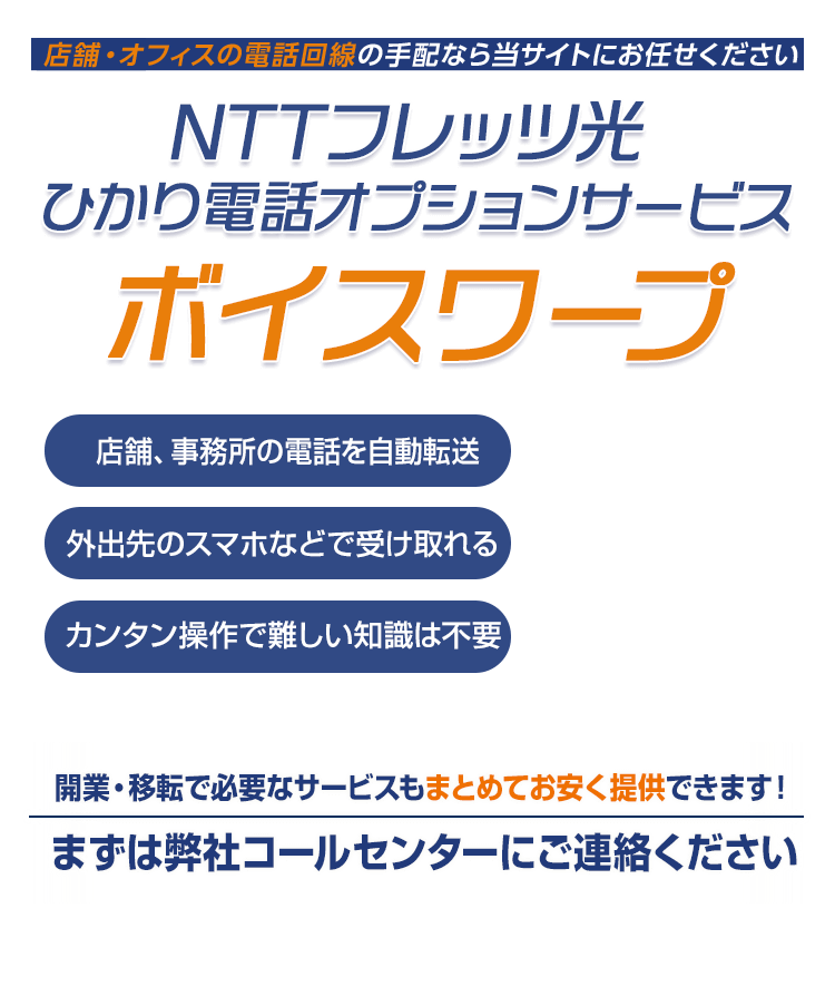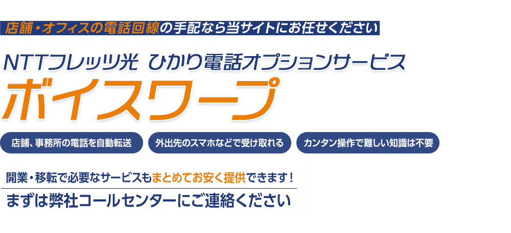 ボイスワープは、店舗や事務所の固定電話にかかってきたお客様からの大切な電話を、外出先の携帯電話などに自動転送できるNTT西日本 ひかり電話のオプションサービスです。
